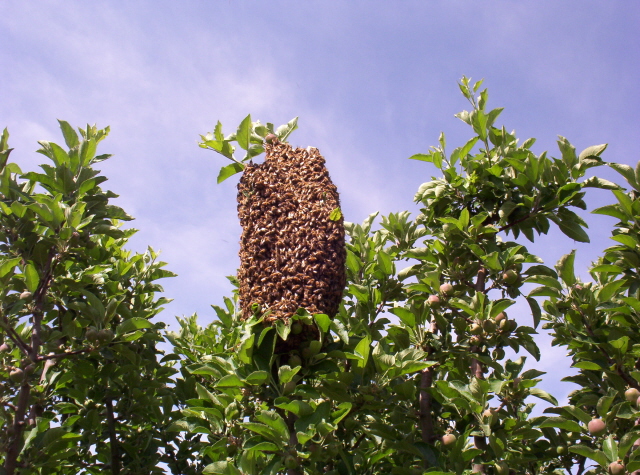 That was the good wife , standing about fifteen feet away , car -door opened, askance as she studied the inherent madness of her husband. She probably thought I was about to break my foolish neck. It should be said that there is never a dull moment in my life, either my internal one of the mind, or all that stuff that happens in the physical world on a daily basis.I was presently balancing somewhat tenuously on the tallest ladder I possessed….not a great claim to fame by any means…the one I got for getting in and out of the loftspace once a year to place and retrieve the Christmas -tree decorations. It would obviously not suffice in this present scenario. Yes , it was dodgily leaning on a few tangled , scratchy branches and I was balancing like a half-demented spaceman atop it, waving and balancing a six-foot fence-plank with one hand as I swayed back and forth , clinging and wondering how I could possibly dislodge this ball of life just feet beyond the reach of the plank.It wasn’t really such a great idea in any case because the likelihood was that it would only create some mad consternation above my head ,instead of dropping the bees within my reaching hands, or put my back out of commission in the process..